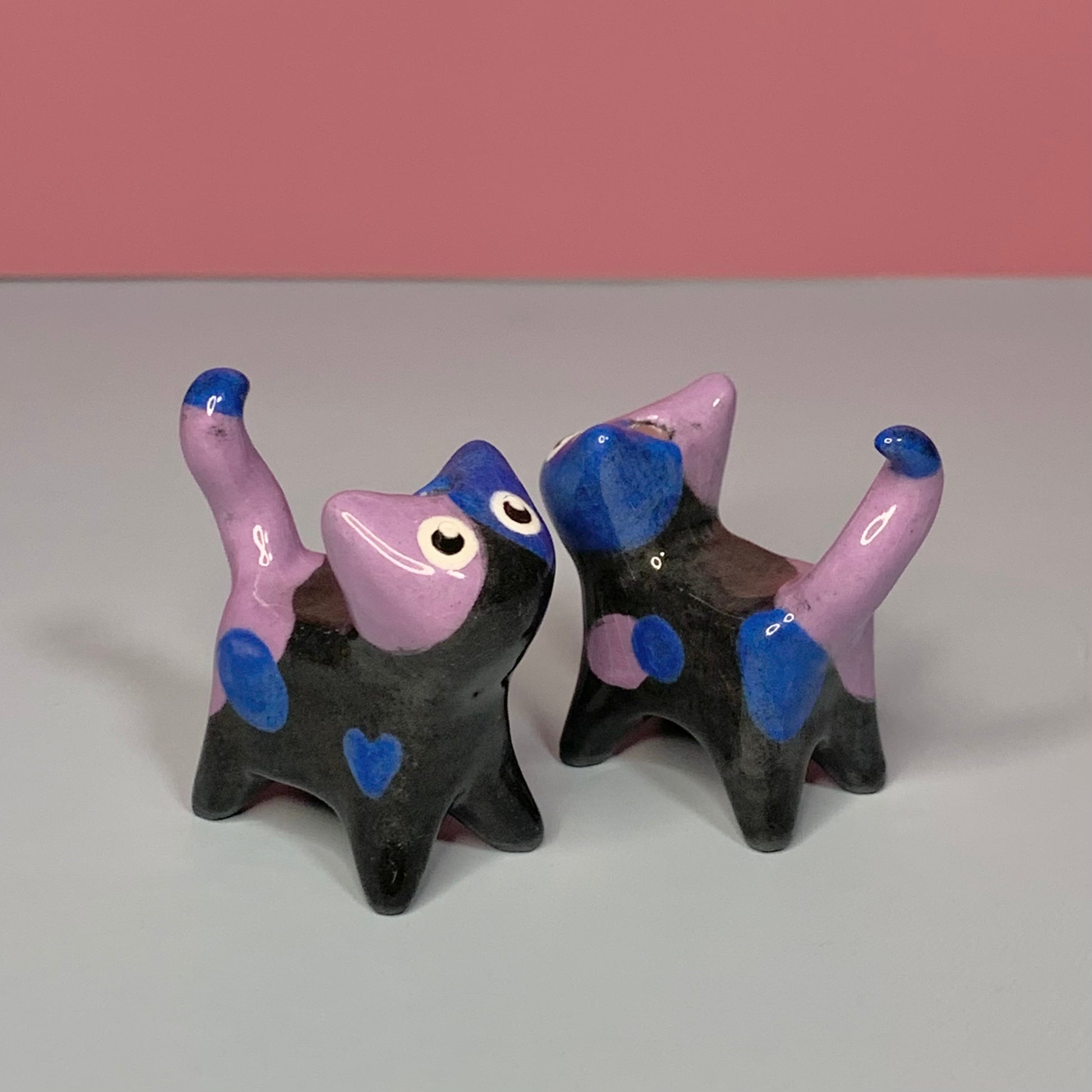 ❤️These cats were hand molded from a white clay, painted with underglazes, and placed in the kiln to bisque fire. Once bisqued the figurine is brushed with a clear glaze to accentuate texture, and then back into the kiln it goes so that the glaze turns glossy and colors embolden