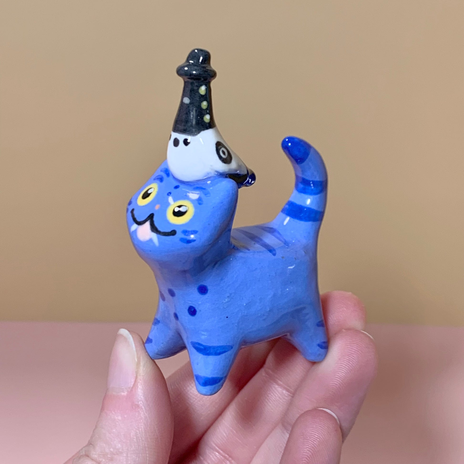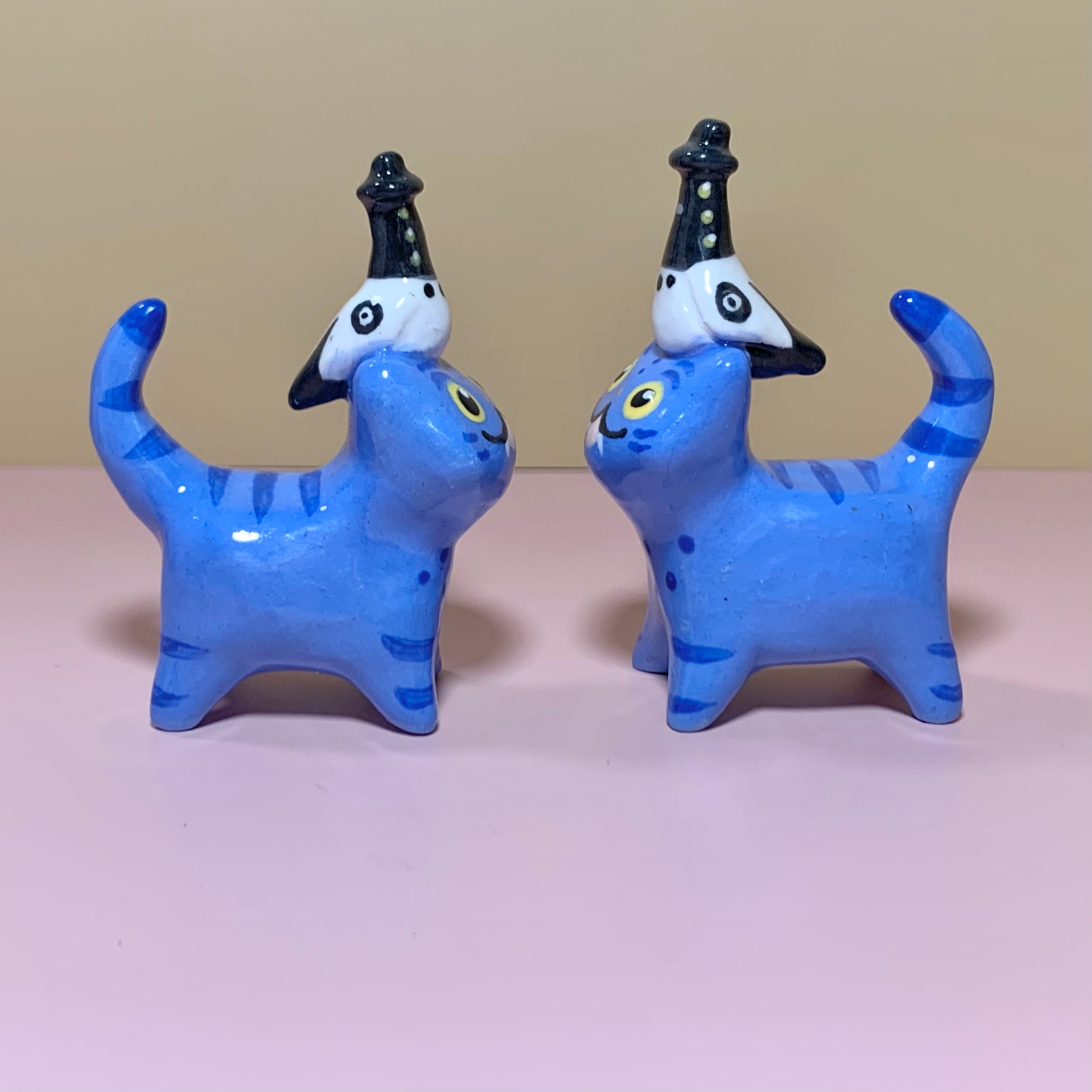 ❤️These cats were hand molded from a white clay, painted with underglazes, and placed in the kiln to bisque fire. Once bisqued the figurine is brushed with a crackling clear glaze to accentuate texture, and then back into the kiln it goes so that the glaze turns glossy and colors embolden!